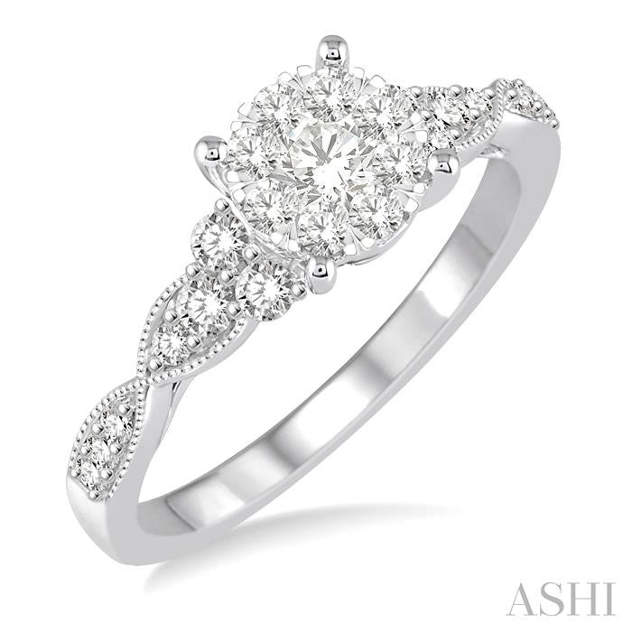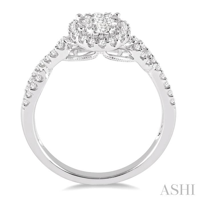 A marvel that is both delicate yet powerful in its brilliance, this round Lovebright engagement ring with 23 radiant round cut diamonds is astounding in its beauty. The diamonds in the center are invisible set while those on the periphery are prong set. This exquisite ring is cast in milgrain finish in 14 karat White Gold. Total diamond weight is 1/2 Ctw. Other metal types & colors may be available.