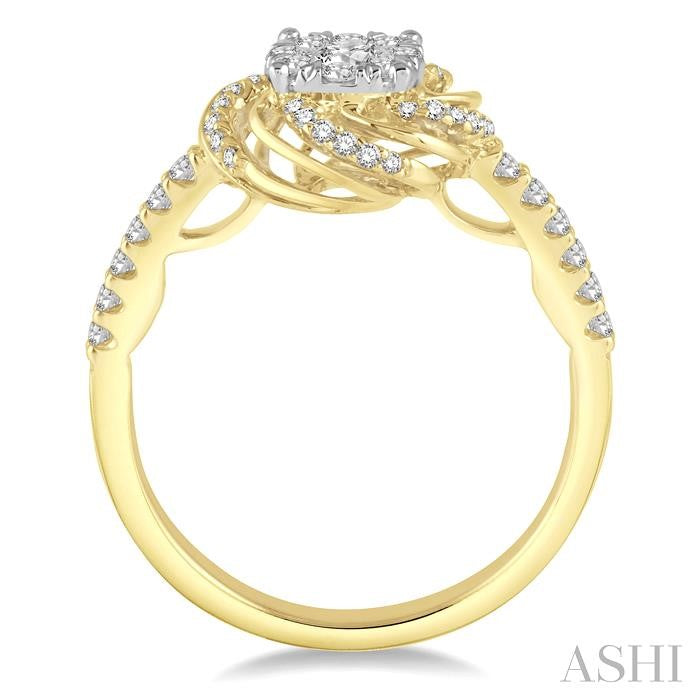 An exceptionally unique design goes into creating this magnificent Lovebright Ladies Engagement ring. It features 51 brilliant round cut diamonds in a floral patterned design with prong and invisible set stones. The ring is made in 14 karat Yellow and White Gold. Total diamond weight is 1/2 Ctw. Other metal types & colors may be available.