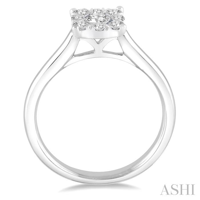 This Square Shape Lovebright Ring has a design that exudes purity. A simple band gives way to a gorgeous setting of 9 charismatic round cut diamonds. These diamonds are skillfully crafted in a invisible setting in a square shape. This ring is made in 14 karat White Gold with normal finish. Total diamond weight is 1/2 Ctw. Other metal types & colors may be available.