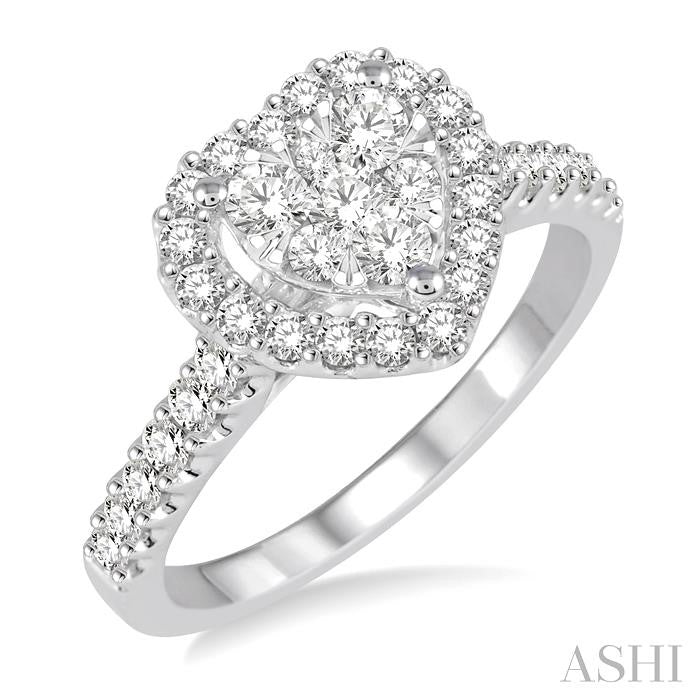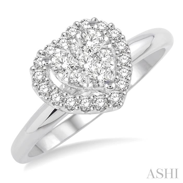 This truly delightful Heart Shaped Lovebright Ring spells sophisticated passion. Embodied with 47 fiery round cut diamonds, it has a heart shaped core created with stones in invisible setting and surrounded by prong setting. This ring is made in 14 karat White Gold with normal finish. Total diamond weight is 1/2 Ctw. Other metal types & colors may be available.