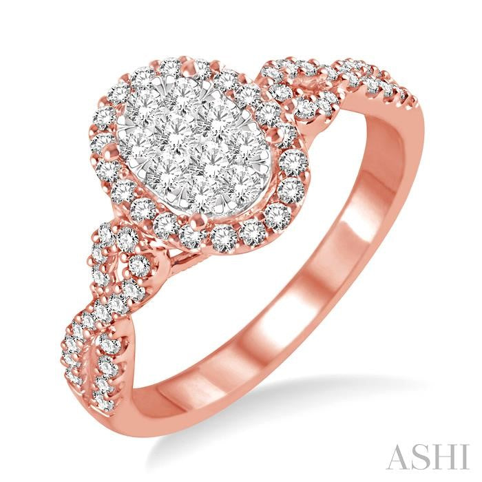 Let this lovebright diamond ring be a beautiful expression of your love to her. Styled in 14 karat shining rose and white gold this oval shape ring showcases a set of 10 invisible set round cut diamonds at the center. Brilliant 54 pave set round cut diamonds, beautifully encompasses the center in oval design and embellishes the spiral design shank with a sparkling row of diamonds. Total diamond weight is 5/8 ctw. Other metal types & colors may be available.