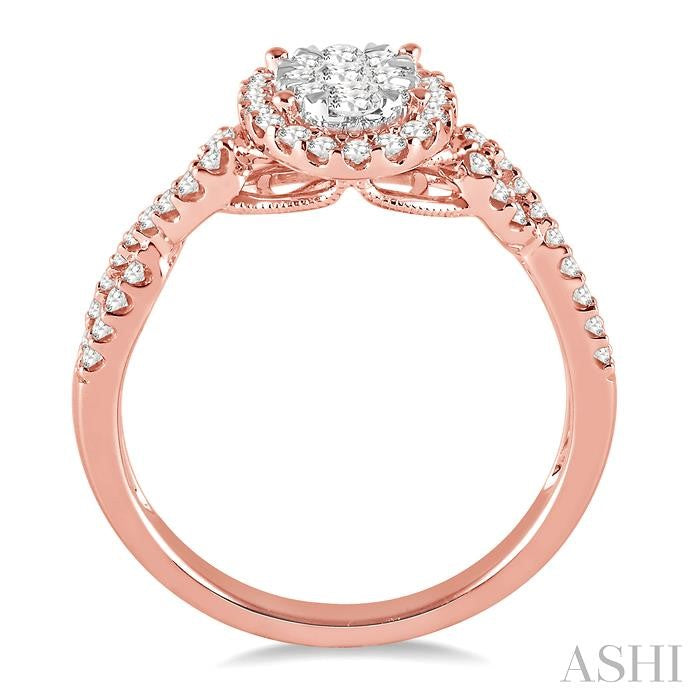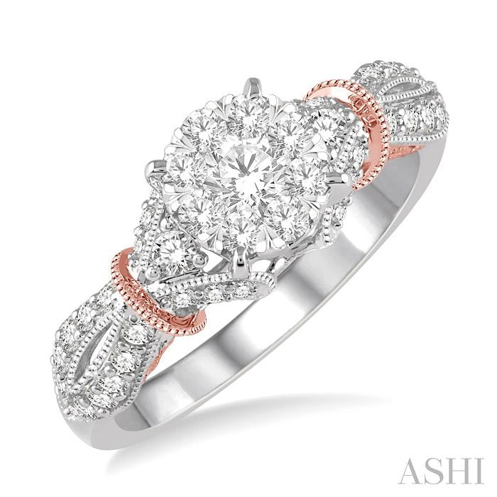 This stunning diamond engagement ring is a perfect accompaniment of your sweet proposal. Crafted in luxurious 14 karat white and rose gold, the lattice ring features 59 round diamonds finely set in invisible, prong and pave setting to create a remarkable solitaire style proposal piece. The rose gold carved milgrain finish gives this 'Lovebright' ring a touch of utter sophistication. This richly decorative and vibrant diamond ring makes a perfect red carpet accessory. Total diamond weight is 5/8 Ctw. Other metal types & colors may be available.