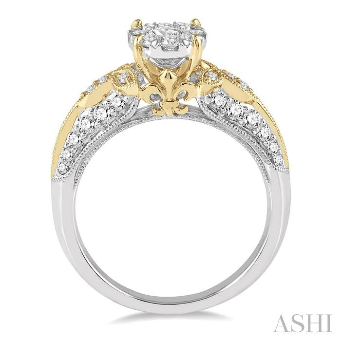 A perfect symbol of eternity and grandeur, this majestic diamond engagement ring shines with profound brilliance. Crafted in enduring 14 karat white and yellow gold, the ring features 41 round brilliant diamonds of 3/4 Ctw finely encrusted in invisible, prong and pave setting for exceptional radiance and larger look. The milgrain finish with Yellow Gold trinity knots on the shank and the Fleur-de-lis in the gallery give this 'Lovebright' ring a remarkable vintage look that she always desired. Total diamond weight is 3/4 Ctw. Other metal types & colors may be available.