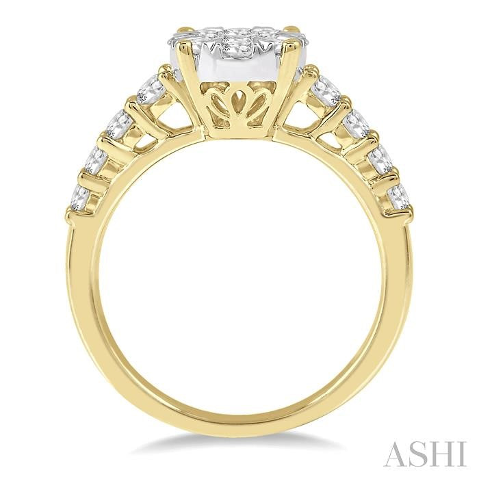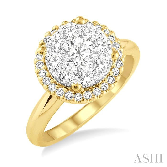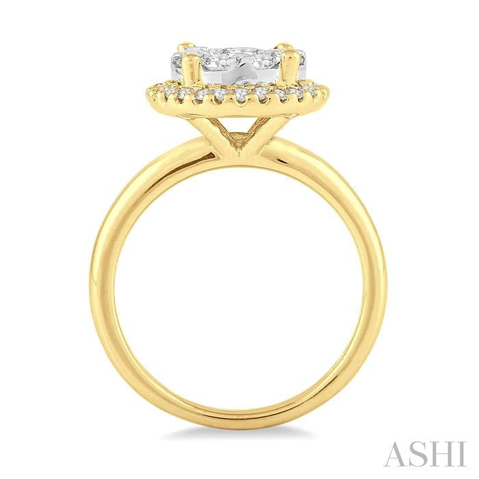 Let this 14 karat yellow and white gold Lovebright diamond engagement ring be a beautiful expression of your love and commitment. Featuring an invisible set round cut diamond at the center haloed by 8 round cut invisible set diamonds and engrossed by 22 sparkling round cut diamonds in pave setting. Total diamond weight is 3/4 Ctw. Other metal types & colors may be available.