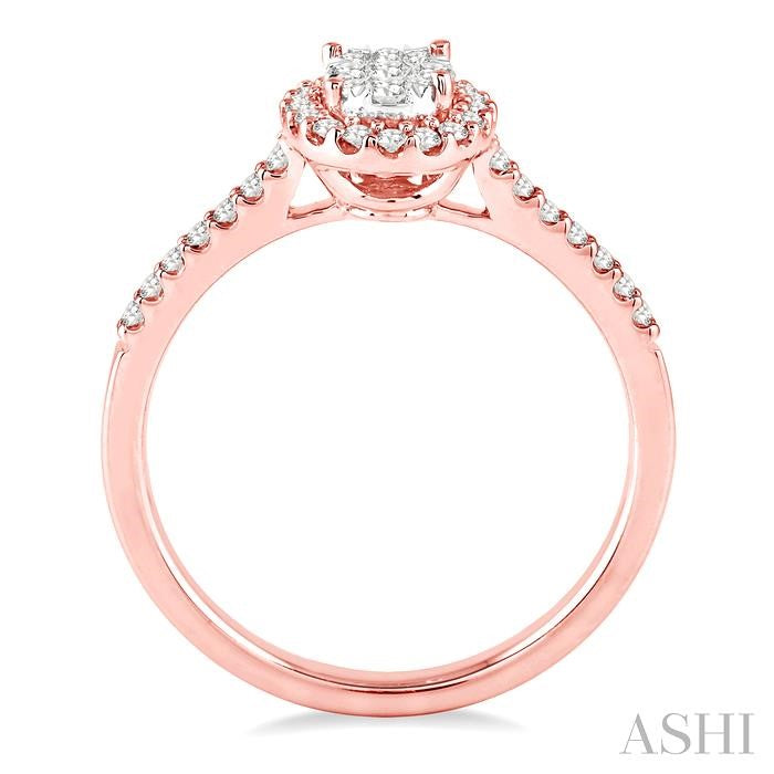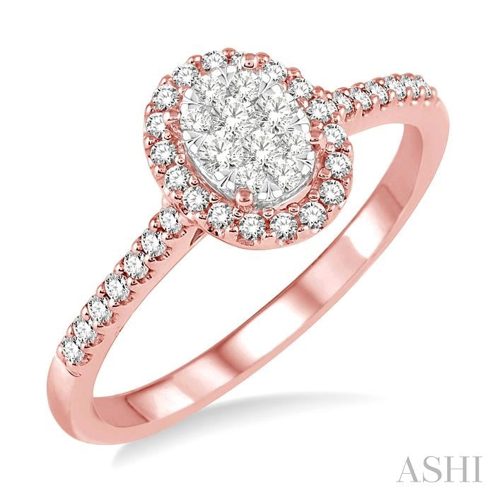 Signify your pledge to love her forever with this stylish diamond lovebright ring. Styled in 14 karat shining rose and white gold this oval shape ring showcases a set of 10 invisible set round cut diamonds at the center. Brilliant 32 prong set round cut diamonds, beautifully encompasses the center in oval design and embellishes the shank with a row of dazzling diamonds. Total diamond weight is 1/3 ctw. Other metal types & colors may be available.