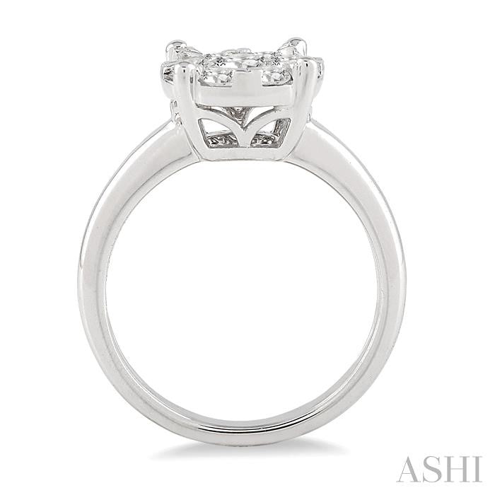 A divine cluster of 29 round cut diamonds captures the brilliance of this unique Heart Shaped Lovebright Ring. With a center of radiant invisible set diamonds and surrounded by prong set diamonds, the ring envelops you in love. This ring is made in 14 karat White Gold with normal finish. Total diamond weight is 1/2 Ctw. Other metal types & colors may be available.