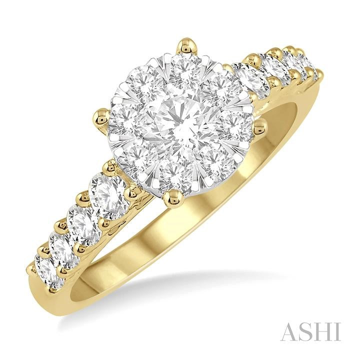 The brilliance of the raised round center mount makes this diamond Lovebright ring apt for proposing to the love of your life. Invisible set nine shining round cut diamonds decorate the 14 karat white gold carved mount and offer a big solitaire look. Adding to the marvelous structure is the eight prong set round cut diamonds that line the yellow gold shank, four on either side of the white gold center mount. Made in 14 karat yellow and white gold, this beautiful ring makes an instant choice for buyers seeking an engagement ring. Total diamond weight is 1 1/10 ctw. Other metal types & colors may be available.