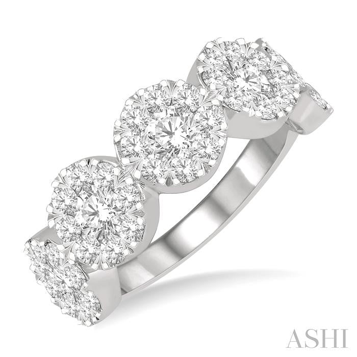 Magnificent, grand, beautiful, and lustrous are some of the words that describe the Lovebright Collection, from which this awesome diamond ring hails. It features 5 circular mounts on the ring top, all of which are decorated with diamonds. There is a total of 45 invisible set round cut diamonds adorning the mounts, a 1/8 ctw invisible set round cut diamond in the center and 8 smaller invisible set round cut diamonds encircling it, 9 diamonds each on the 5 mounts. The Lovebright diamond ring is crafted in a polished rhodium finish 14 karat white gold. Total diamond weight is 2 ctw. Other metal types & colors may be available.