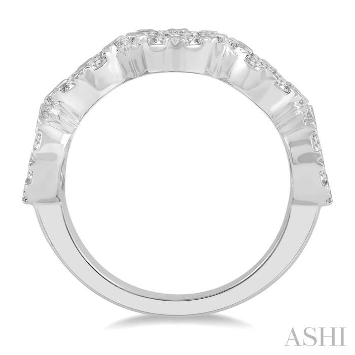 A cleverly carved lattice Lovebright diamond ring, this adds another great piece to the majestic Lovebright collection. It features a circular center mount that is showcased by 9 invisible set round cut diamonds, one in the center and 8 surrounding it in a circle. The shank is made of marquise shapes, with marquise mounts bordered by a chiseled marquise exterior trim. Each side features two mounts, both of which are embellished with prong set and pave set round cut diamonds. The gallery also displays a marquise mount at the front and back. This is adorned by a bezel set and prong set round cut diamond each. Milgrain highlights the shank and gallery, lending to the beauty of the ring, which is molded in 14 karat white gold. Total diamond weight is 3/8 ctw. Other metal types & colors may be available.