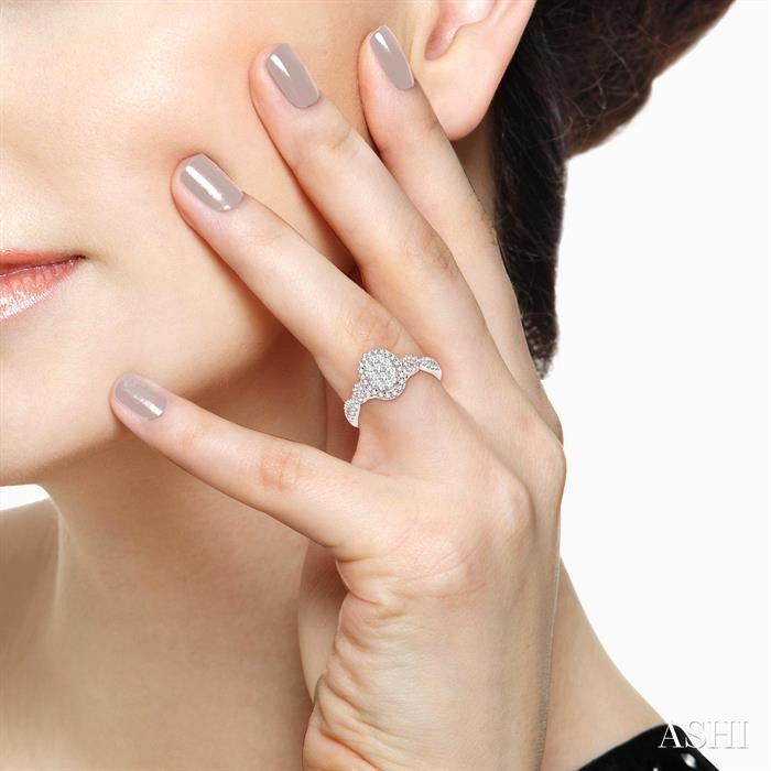Let this lovebright diamond ring be a beautiful expression of your love to her. Styled in 14 karat shining white gold this oval shape ring showcases a set of 10 invisible set round cut diamonds at the center. Brilliant 54 pave set round cut diamonds, beautifully encompasses the center in oval design and embellishes the spiral design shank with a sparkling row of diamonds. Total diamond weight is 5/8 ctw. Other metal types & colors may be available.