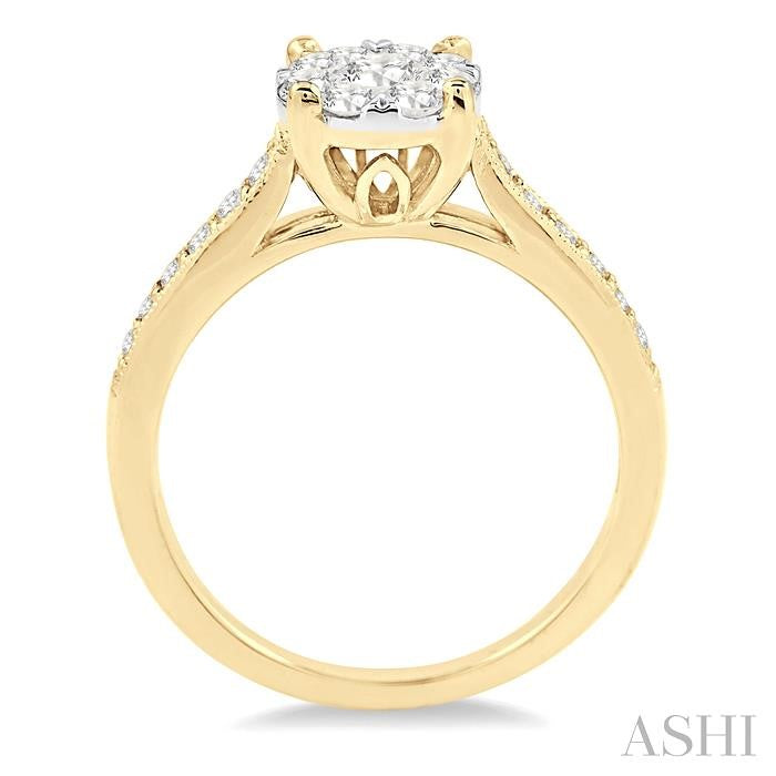 Illuminate her ring finger with this exquisite lovebright diamond engagement ring crafted in lustrous 14 karat yellow and white gold. Featuring an invisible set round cut diamond at the center haloed by 8 round cut invisible set diamonds further embellished with 34 sparkling round cut diamonds in pave setting. Total diamond weight is 5/8 ctw. Other metal types & colors may be available.