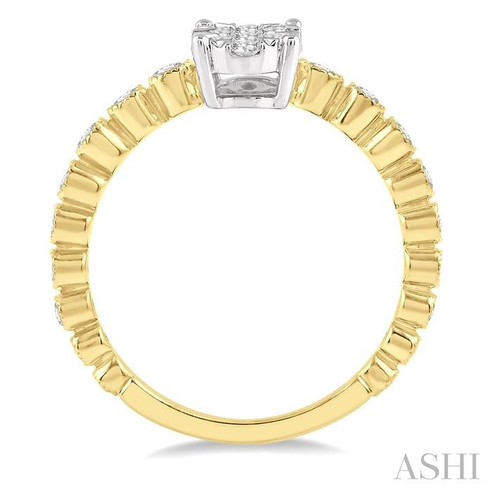 This captivating lovebright diamond ring will make your love more special for her. Beautifully crafted in cool 14 karat yellow and white gold, this ring features a trios of framed round diamond arrays arranged side-by-side along the shank. Additional diamonds line the shank. 39 round cut diamonds are set in invisible, channel and bezel set. Total diamond weight is 1/3 ctw. Other metal types & colors may be available.