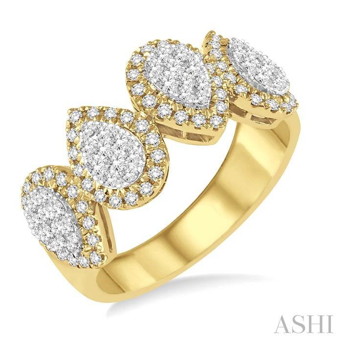 This exceptional and modish diamond Lovebright ring is a perfect choice for your stylish woman. Created in luminous 14 karat yellow and white gold this intriguing ring features five pear shaped frames filled with shimmering sets of 36 invisible set round cut diamonds and engrossed by dazzling 68 pave set round cut diamonds. Total diamond weight is 3/4 ctw. Other metal types & colors may be available.