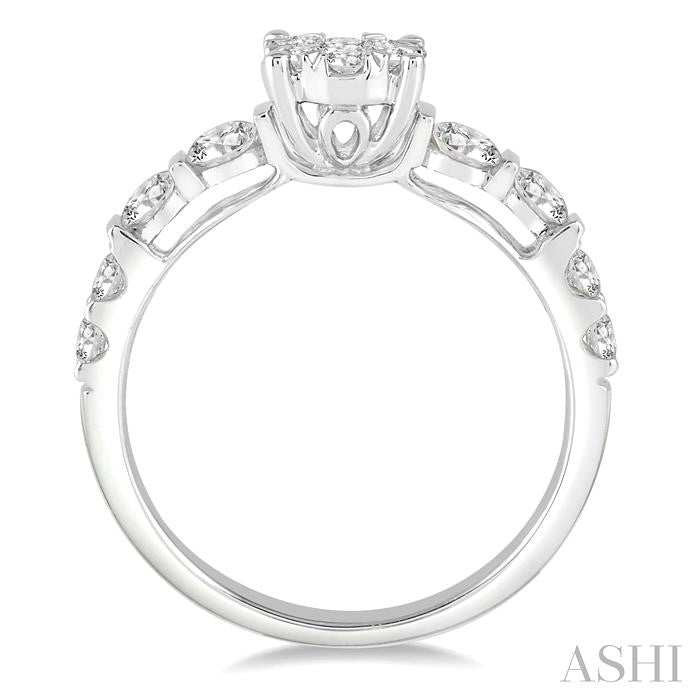 Eye-catching and elegant, this Lovebright diamond engagement ring steals your heart, just like the other rings in the collection. It features a raised oval shape center mount, embellished with 10 invisible set round cut diamonds, 2 in the center and 8 diamonds encircling the two. The shank displays a pear mount each flanking the center mount, before continuing down in a reverse taper. Each of the two pear mounts is accented with a prong set pear cut diamond each, while the tapered shank is plain gold. The Lovebright diamond engagement ring is crafted in 14 karat white gold. Total diamond weight is 3/4 ctw. Other metal types & colors may be available.
