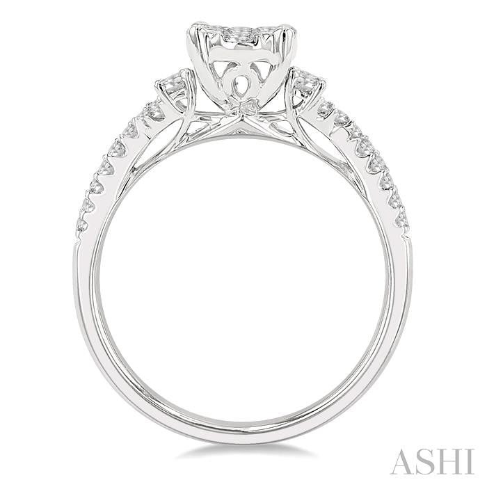 Propose with sophistication, with a diamond engagement ring from the elegant Lovebright Collection, like the one here. It will surely sweep her off the floor. The ring here features a raised oval shape center mount that is embellished with 10 invisible set round cut diamonds, 2 in the center and 8 encircling them. Adding beauty to the centerpiece is a split crisscross shank that is further decorated with 48 micro wall set round cut diamonds, 24 diamonds each on either side of the shank. The Lovebright diamond engagement ring is styled in 14 karat white gold. Total diamond weight is 5/8 ctw. Other metal types & colors may be available.