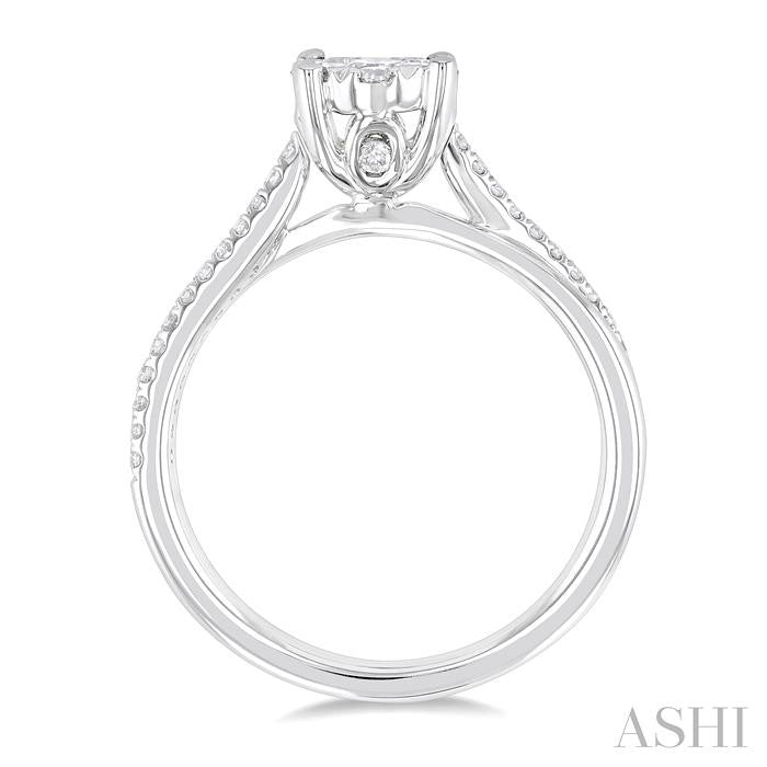 A stunning symbol of your enduring love and commitment, this Lovebright diamond engagement ring is sure to win her heart. The ring features a dazzling circular center mount with a 1/8 ctw invisible set round cut diamond in the center, beautifully haloed by 8 invisible set round cut diamonds. The shank showcases a delicate cutwork design with two marquise-shaped mounts on each side, separated by intricate node-like structures. Each marquise mount sparkles with 2 pave set round cut diamonds, total 8 diamonds, and is elegantly bordered with milgrain detailing. The Lovebright diamond engagement ring is fashioned in a polished rhodium finish 14 karat white gold. Total diamond weight is 3/8 ctw. Other metal types & colors may be available.