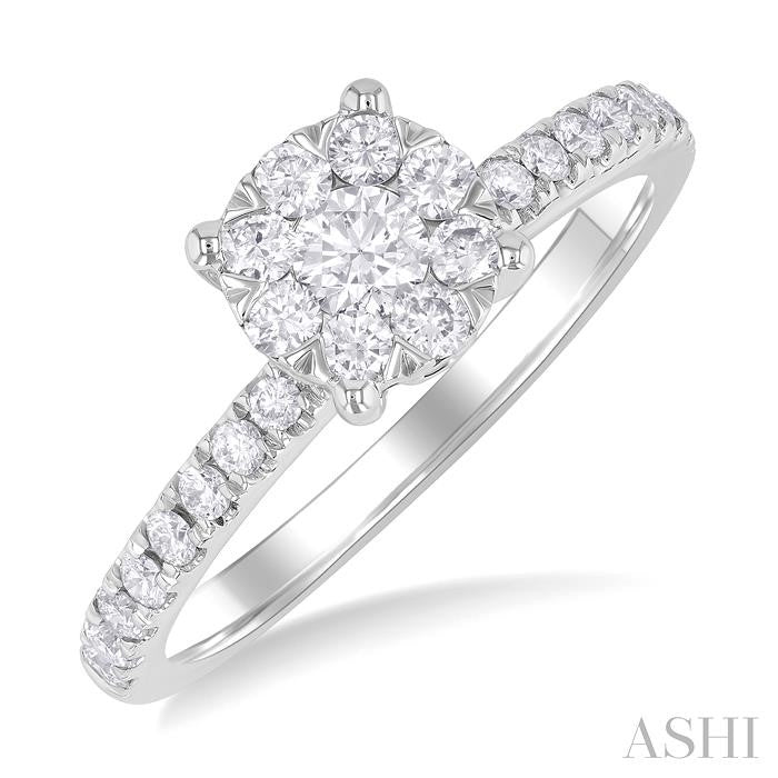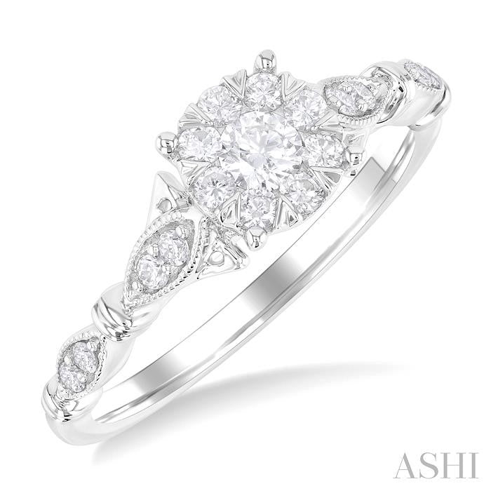 Marking the beginning of a path to eternal love, this stunning Lovebright diamond engagement ring brings alive a lifetime filled with cherished memories and shared dreams. It features a beautiful carved shank, and a raised circular center mount, upon which sparkles a radiant cluster of round cut diamonds. There is an invisible set round cut diamond in the center haloed by 8 smaller invisible set round cut diamonds. 3 each, total 6, prong set round cut diamonds form a triangular setting, just below the center mount and slightly above the shank. The entwined look carved shank is adorned with 4 each, total 8, pave hand set round cut diamonds on either side. A milgrain finish is also seen on the shank. The Lovebright engagement ring is molded in a polished rhodium finish 14 karat white gold. Total diamond weight is 1/2 ctw. Other metal types & colors may be available.