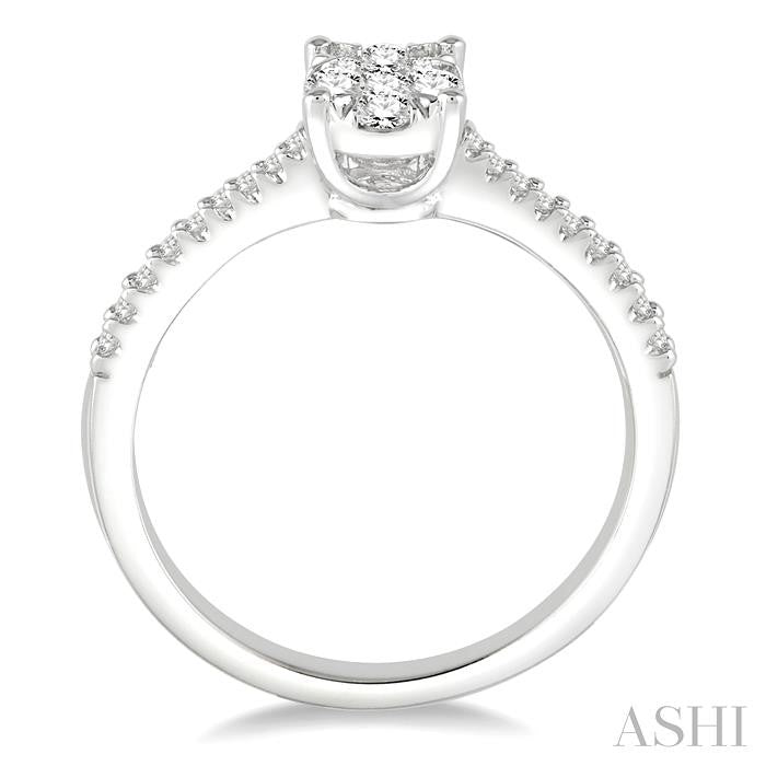 Simple but beautiful, this Lovebright Petite diamond fashion ring adds classic charm to your everyday look. It features an oval-shaped centerpiece adorned with round cut diamonds, creating a captivating focal point. The centerpiece is beautifully complemented by a cluster of 10 invisible-set round cut diamonds, adding sparkle and brilliance to the design. A plain gold reverse tapered shank highlights the beauty of the oval centerpiece. The Lovebright diamond fashion ring is crafted in a rhodium finish 10 karat white gold. Total diamond weight is 1/10 ctw. Other metal types & colors may be available.