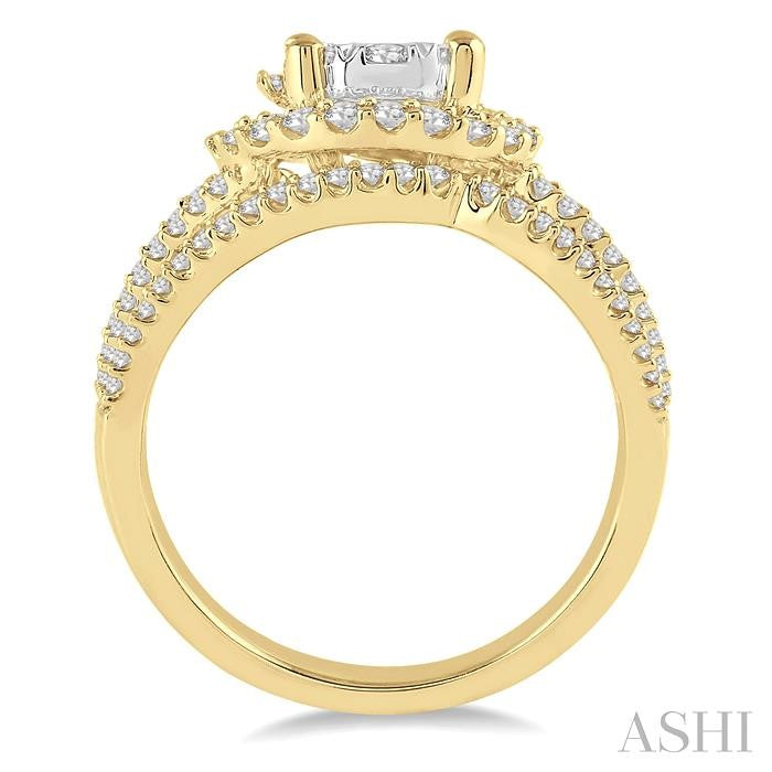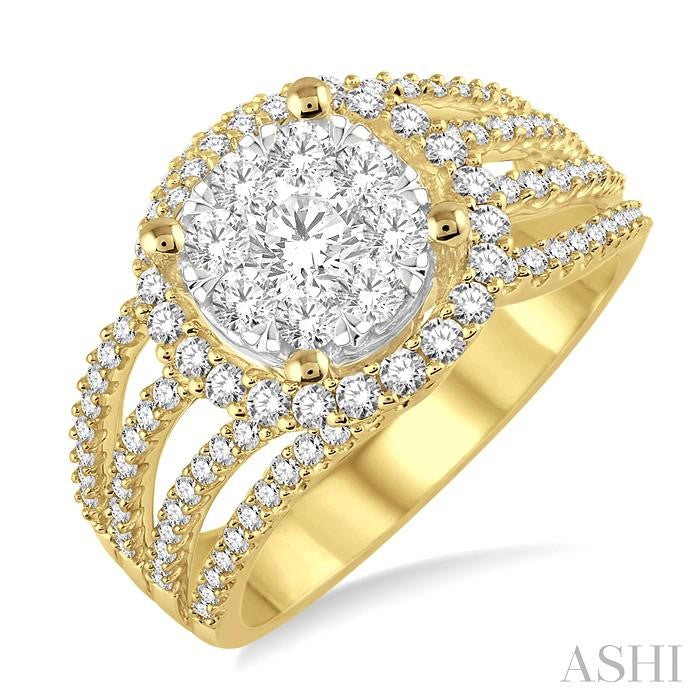 This dazzling diamond lovebright ring will bring an everlasting smile on her face. Styled in 14 karat shining yellow Gold this open work stylish designed ring showcases an array of 9 invisible set round cut diamond at the center further encompasses by dazzling 134 pave set round cut diamonds framing a circle and embellishing the split shank in brilliant rows adding sparkle to the beauty of this opulent ring. Total diamond weight is 1 ctw. Other metal types & colors may be available.