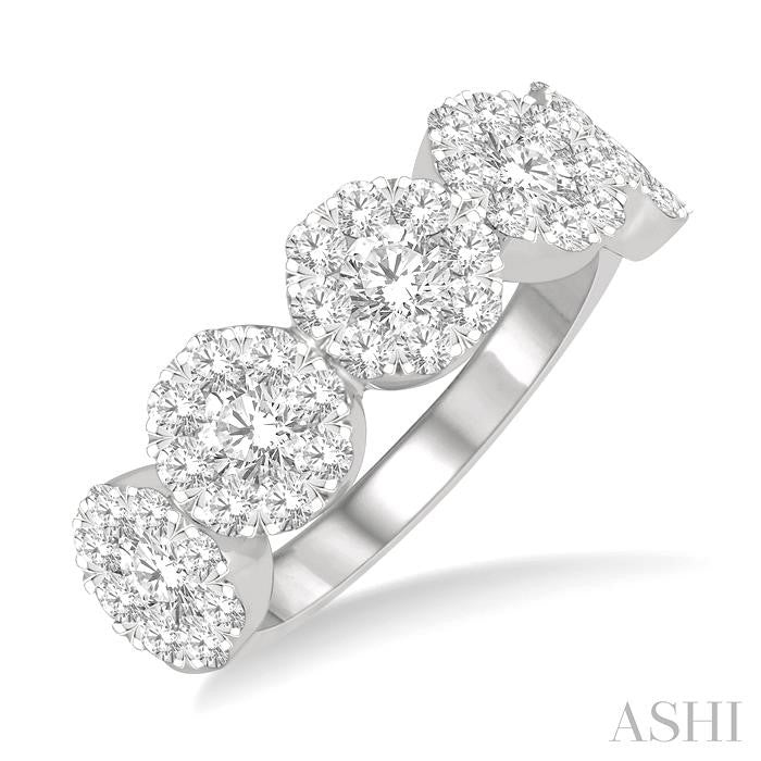 Magnificent, grand, beautiful, and lustrous are some of the words that describe the Lovebright Collection, from which this awesome diamond ring hails. It features 5 circular mounts on the ring top, all of which are decorated with diamonds. There is a total of 45 invisible set round cut diamonds adorning the mounts, a 1/8 ctw invisible set round cut diamond in the center and 8 smaller invisible set round cut diamonds encircling it, 9 diamonds each on the 5 mounts. The Lovebright diamond ring is crafted in a polished rhodium finish 14 karat white gold. Total diamond weight is 1 1/2 ctw. Other metal types & colors may be available.