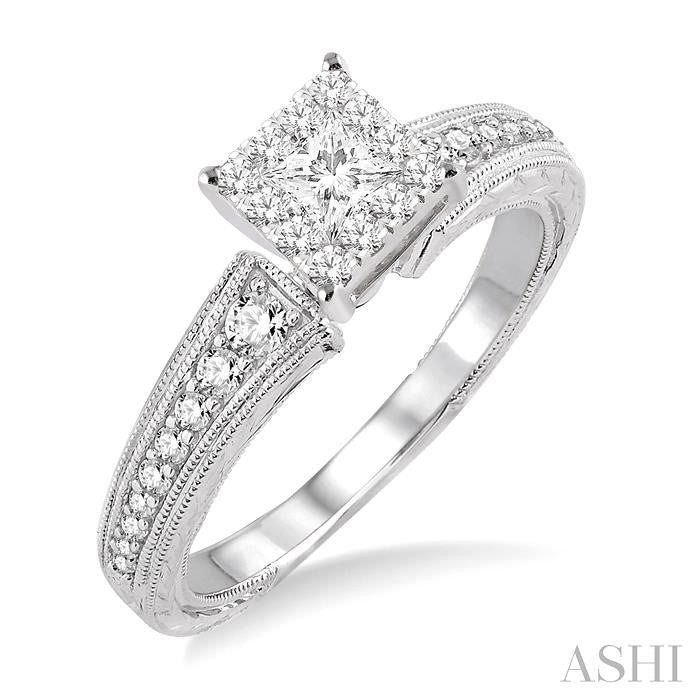 Show her your lasting love with this enticing milgrain finish lovebright diamond engagement ring. Styled in 14 karat shining white gold this ring showcases an array of 13 invisible set princess and round cut diamonds at the center accented by 20 sparkling round cut prong and pave set diamonds that flow down the shank in a brilliant row. Total diamond weight is 1/2 ctw. Other metal types & colors may be available.