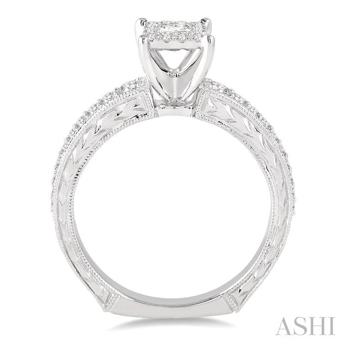 This Lovebright Engagement Ring captures one and all with its divine luster. It is bejeweled with 27 beautiful round cut diamonds with a invisible set core and prong set periphery in a unique inter-twined design. This ring is made in 14 karat White Gold with engraving and milgrain finish. Total diamond weight is 1/2 Ctw. Other metal types & colors may be available.