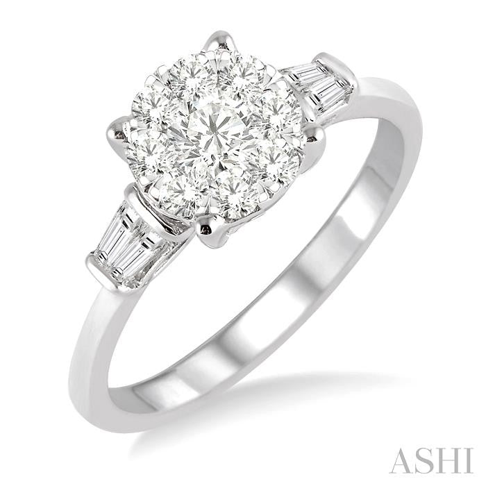 This scintillating lovebright diamond engagement ring is a brilliant beginning to your new chapter of life. Styled in gleaming 14 karat white gold the center of piece blazes with a set of 9 sparkling invisible set round cut diamond, with 4 channel set baguette cut diamonds on the shank accentuate the rings elegance. Total diamond weight is 3/4 ctw. Other metal types & colors may be available.