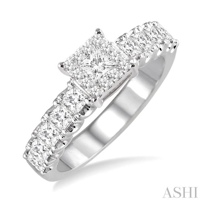 Present this alluring diamond lovebright ring to tell her that she is the only one with whom you will spend your rest of the life. Styled in lustrous 14 karat white gold this ring features a set of 13 invisible set princess and round cut diamonds at its center. The shank is bejeweled with 12 sparkling princess cut diamonds to complement the ring. Diamonds are beautifully prong set. Total diamond weight is 1 ctw. Other metal types & colors may be available.
