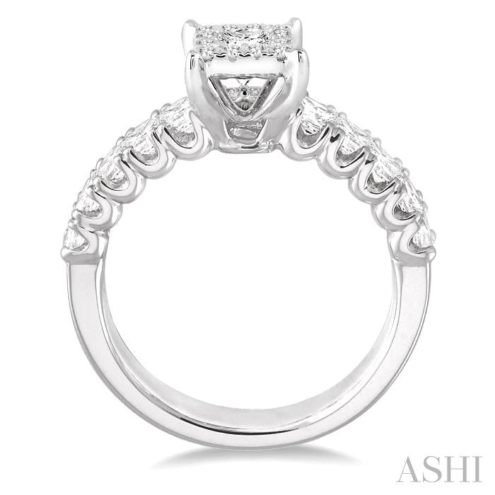 Capture all your special love moments in this timeless diamond lovebright ring. Styled in luminous 14 karat white gold this square shape ring features 3 invisible set arrangements of 27 sparkling round cut diamonds. Brilliant 62 scintillating pave set round cut diamonds beautifully encompasses the center arrangements and embellishes the shank in dazzling rows. Total diamond weight is 1 3/8 ctw. Other metal types & colors may be available.