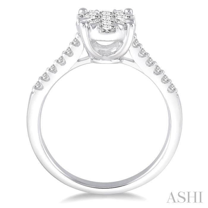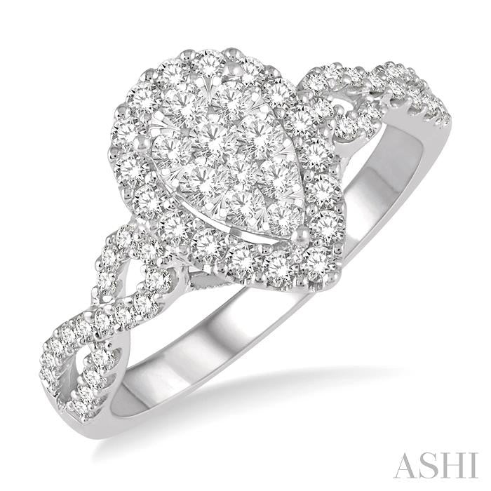 This stylish diamond lovebright ring will make her the envy of all the onlookers. Styled in 14 karat shining white gold this pear shape ring showcases a set of 10 invisible set round cut diamonds at the center. Brilliant 51 pave set round cut diamonds, beautifully encompass the center in pear design and embellishes the shank with a row of dazzling diamonds. Total diamond weight is 3/4 ctw. Other metal types & colors may be available.