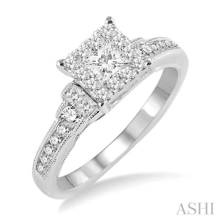Ask her to be yours forever with this brilliant diamond lovebright engagement ring. Set on luminous 14 karat white gold this milgrain finish ring ablaze with the glowing radiance of a set of 9 invisible set round cut diamonds and the shank is adorned with 20 prong and bezel set baguette and round cut diamonds with imperial sparkle on the outer edge of the ring. Total diamond weight is 3/4 ctw. Other metal types & colors may be available.