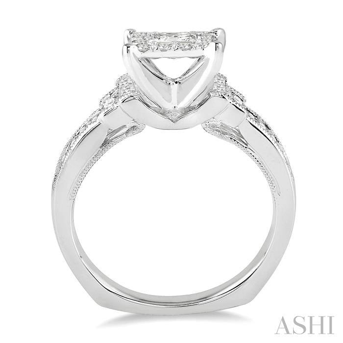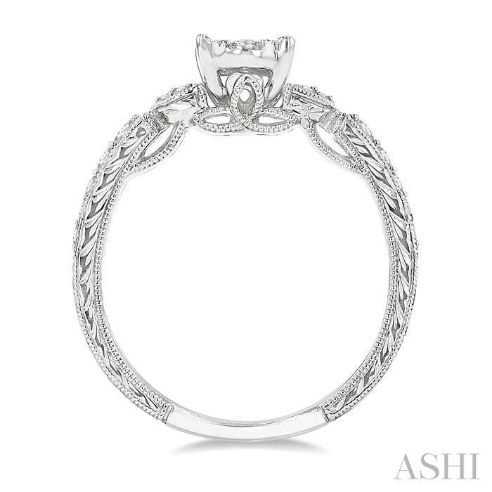 A beautiful carved shank diamond engagement ring, this catches the eye instantly. Besides, it comes from the Lovebright Collection that boasts of spectacular designs, including this. It features a raised oval shape center mount that is embellished with 10 invisible set round cut diamonds, 2 in the center and 8 diamonds encircling them. Flanking the center mount from either side on the shank, are 2 each prong set round cut diamonds, total 4. Decorating the carved crisscross shank is 2 each prong set round cut diamonds on the top section, and 3 each on the lower part. A milgrain border highlights the carved shank. The Lovebright engagement ring is crafted in 14 karat white gold. Total diamond weight is 1/2 ctw. Other metal types & colors may be available.