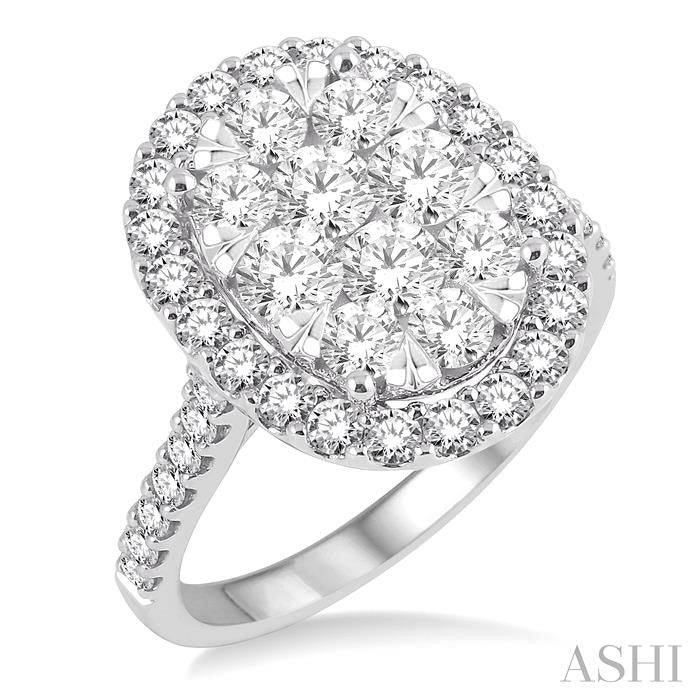 Signify your pledge to love her forever with this stylish diamond lovebright ring. Styled in 14 karat shining white gold this oval shape ring showcases a set of 10 invisible set round cut diamonds at the center. Brilliant 36 prong set round cut diamonds, beautifully encompasses the center in oval design and embellishes the shank with a row of dazzling diamonds. Total diamond weight is 2 ctw. Other metal types & colors may be available.
