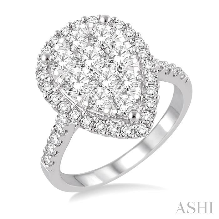 Dazzle the eyes of your beloved with this stylish diamond lovebright ring. Styled in 14 karat shining white gold this pear shape ring showcases a set of 11 invisible set round cut diamonds at the center. Brilliant 36 prong set round cut diamonds, beautifully encompasses the center in pear design and embellishes the shank with a row of dazzling diamonds. Total diamond weight is 1 1/2 ctw. Other metal types & colors may be available.