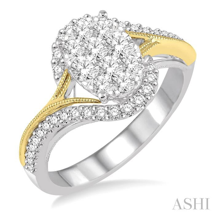 On a special day, surprise your sweetheart with this mesmerizing diamond lovebright ring. Styled in luminous 14 karat white and yellow gold, this pear shape ring centers a set of 10 invisible set round cut diamond embellished by 33 pave set round cut accented diamonds forming a pear shape and one side of the milgrain finish split shank is lined by dazzling diamonds. Total diamond weight is 3/4 ctw. Other metal types & colors may be available.