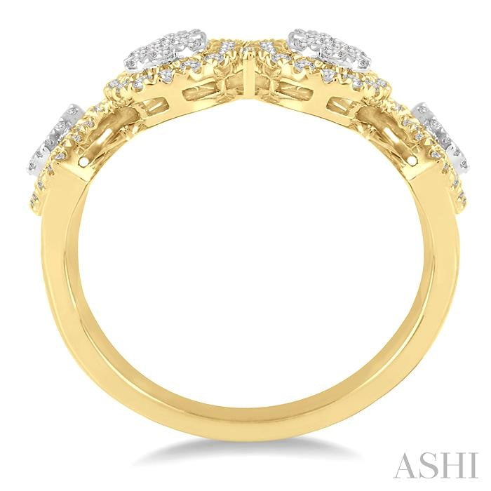 This exceptional and modish diamond Lovebright ring is a perfect choice for your stylish woman. Created in luminous 14 karat yellow and white gold this intriguing ring features five pear shaped frames filled with shimmering sets of 36 invisible set round cut diamonds and engrossed by dazzling 68 pave set round cut diamonds. Total diamond weight is 3/4 ctw. Other metal types & colors may be available.