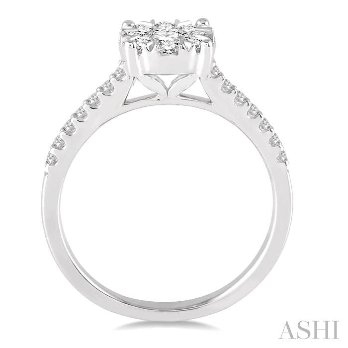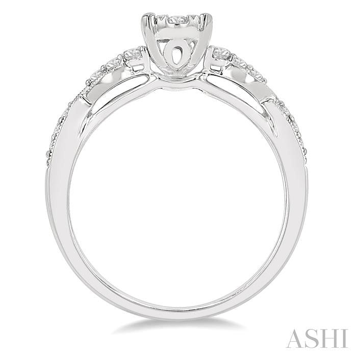 Propose with sophistication, with a diamond engagement ring from the elegant Lovebright Collection, like the one here. It will surely sweep her off the floor. The ring here features a raised oval shape center mount that is embellished with 10 invisible set round cut diamonds, 2 in the center and 8 encircling them. Adding beauty to the centerpiece is a split crisscross shank that is further decorated with 48 micro wall set round cut diamonds, 24 diamonds each on either side of the shank. The Lovebright diamond engagement ring is styled in 14 karat white gold. Total diamond weight is 5/8 ctw. Other metal types & colors may be available.