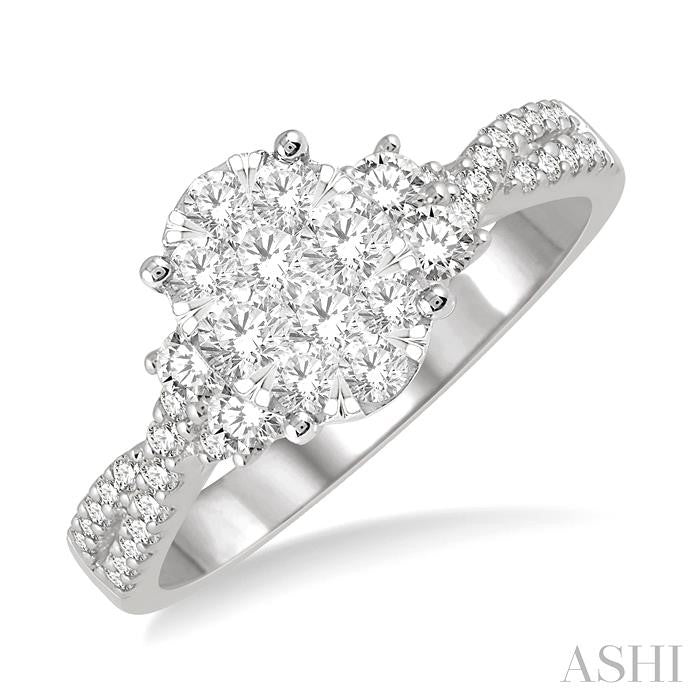 Allure your darling with the sparkle of this beautiful diamond Lovebright ring. Styled in 14 karat shining white gold this round shape ring showcases an array of 9 invisible set round cut diamonds at the center accented by 14 sparkling round cut prong set diamonds that flow down the shank in a brilliant row. Total diamond weight is 3/4 ctw. Other metal types & colors may be available.