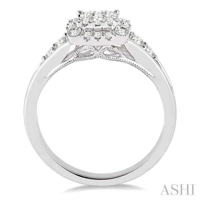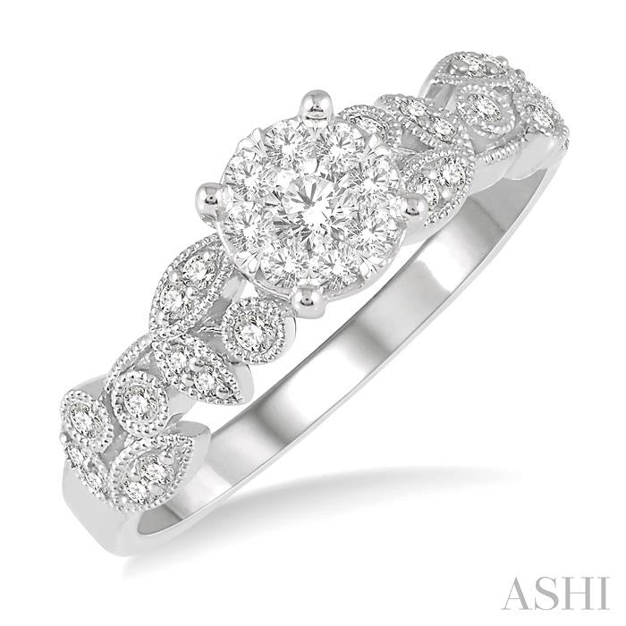 Sublime expression of your enduring love and dedication can be symbolized with this milgrain finish lovebright diamond engagement ring. Crafted in luminous 14 karat white gold this ring ablaze with glowing radiance of an array of 9 invisible set round cut diamonds and the floral designed shank is adorned with 22 round cut diamonds with bezel and pave setting. Total diamond weight is 3/8 ctw. Other metal types & colors may be available.