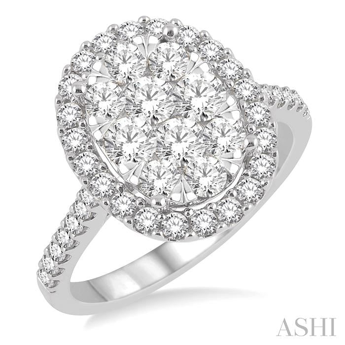 Signify your pledge to love her forever with this stylish diamond lovebright ring. Styled in 14 karat shining white gold this oval shape ring showcases a set of 10 invisible set round cut diamonds at the center. Brilliant 36 prong set round cut diamonds, beautifully encompasses the center in oval design and embellishes the shank with a row of dazzling diamonds. Total diamond weight is 1 1/2 ctw. Other metal types & colors may be available.