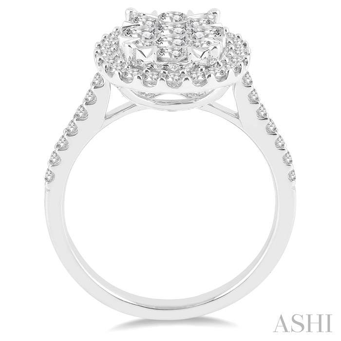 A sparking Lovebright diamond bridal ring, this appeals to the eye instantly. It features a round center mount that is embellished with gleaming round cut diamonds. There is a total of 9 invisible set round cut diamonds decorating the center mount, one in the middle and eight surrounding it in a halo. The invisible setting offers the illusion of a single big diamond, instead of several smaller stones. The ring is styled in 14 karat white gold. Total diamond weight is 1 ctw. Other metal types & colors may be available.