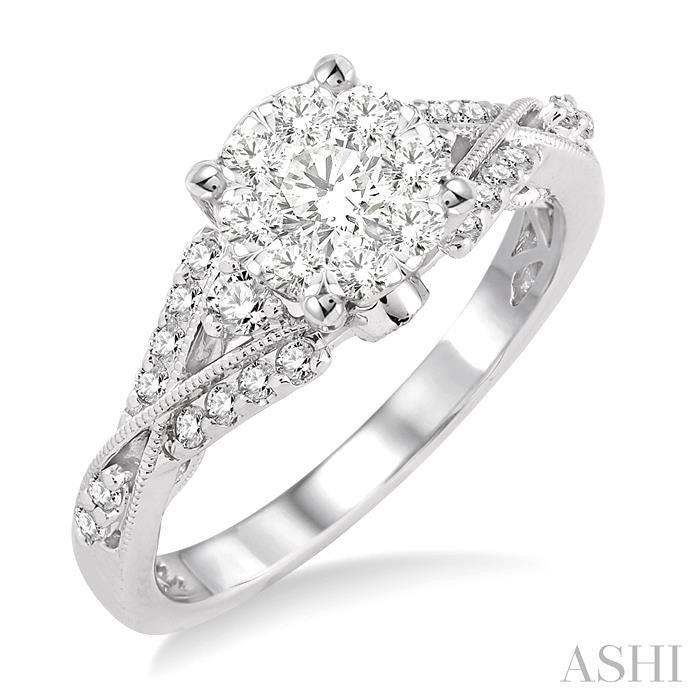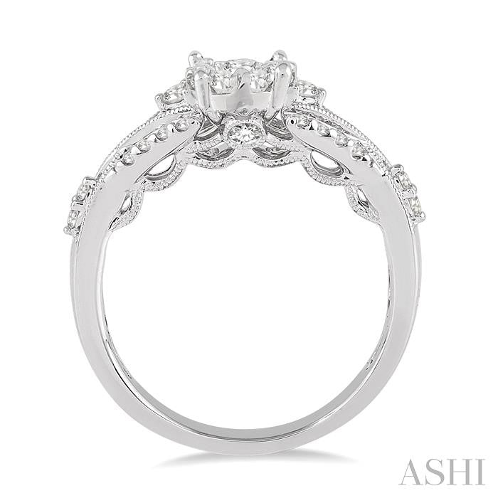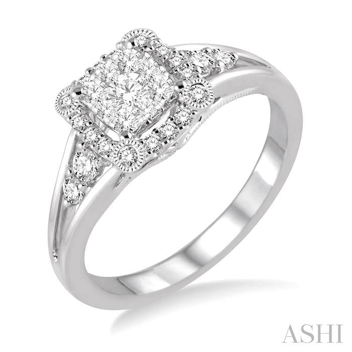 Enhance the beauty of the occasion with this fabulous and stylish Lovebright Ladies Engagement Ring. It is made with 33 exceptionally beautiful round cut diamonds, with a invisible set core and prong and pave setting on the periphery. This ring is made in 14 karat White Gold with milgrain finish. Total diamond weight is 5/8 Ctw. Other metal types & colors may be available.