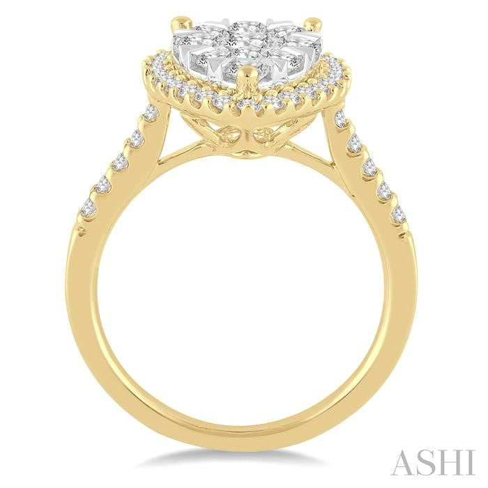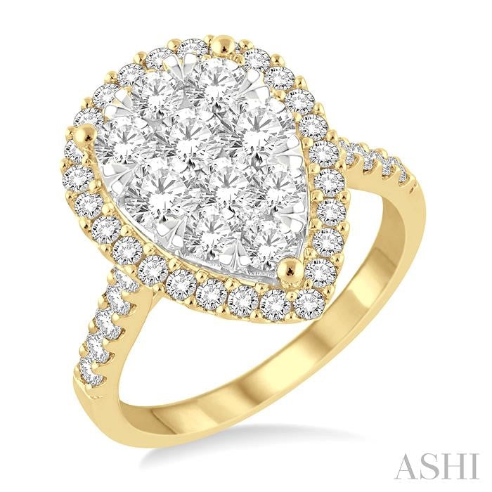 Dazzle the eyes of your beloved with this stylish diamond lovebright ring. Styled in 14 karat shining yellow and white gold this pear shape ring showcases a set of 11 invisible set round cut diamonds at the center. Brilliant 36 prong set round cut diamonds, beautifully encompasses the center in pear design and embellishes the shank with a row of dazzling diamonds. Total diamond weight is 1 1/2 ctw. Other metal types & colors may be available.
