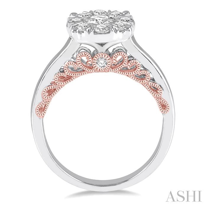Dazzle and delight her with this exquisite diamond lovebright engagement ring. Fashioned on luminous 14 karat rose and white gold this milgrain finish ring features a floral center frame set with 9 invisible set round cut diamonds. Sparkling 28 round cut diamonds bounds the center and lined the intricate design shank. Diamonds are beautifully bezel and prong set. Total diamond weight is 3/4 ctw. Other metal types & colors may be available.