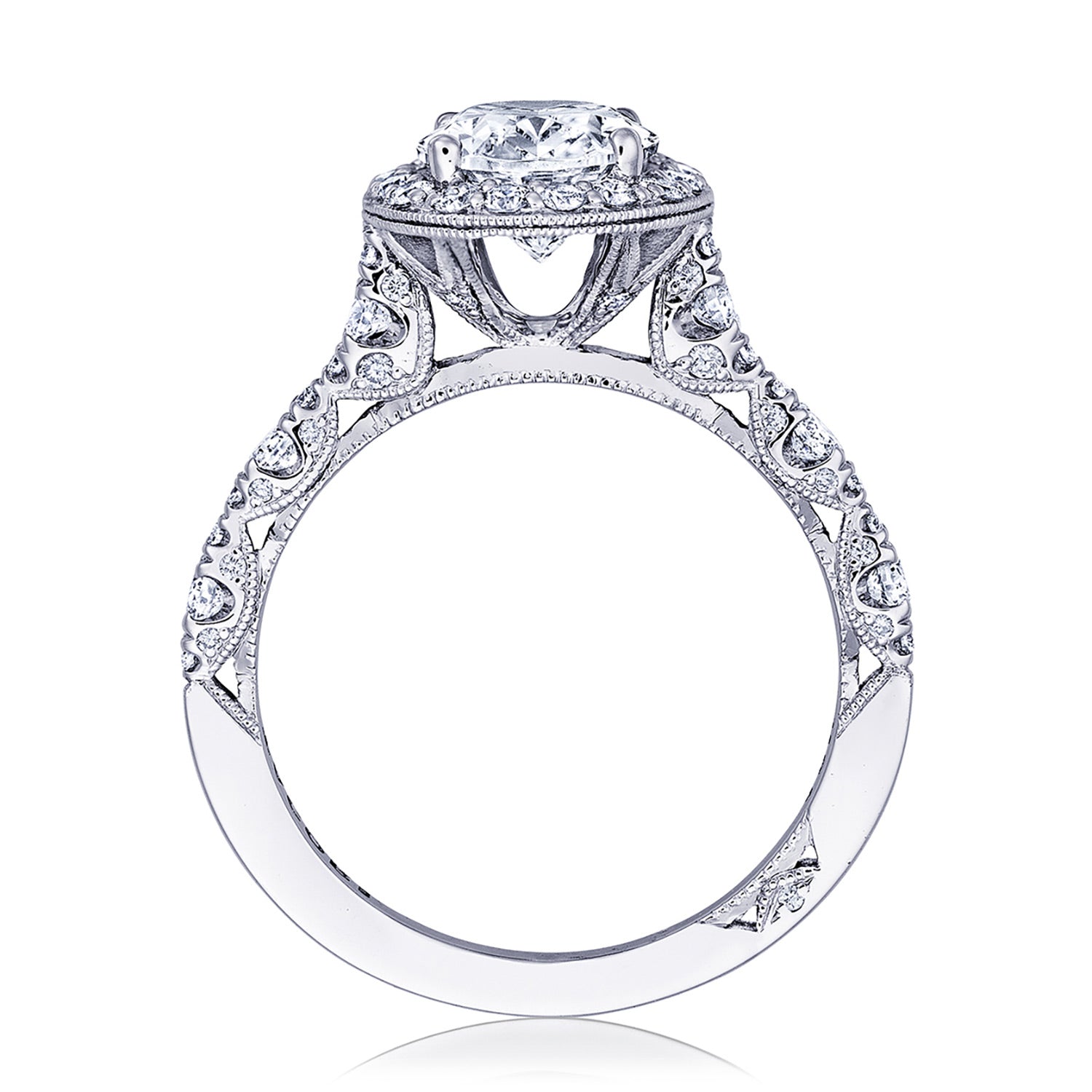 A high-polish ceiling accented with lace-like tracery makes for a stunningly airy setting. The hand-hewn milgrain and pinpoint diamonds add nuance, while a hidden bloom creates dimensional light. A Signature Crescent marks the resting point.