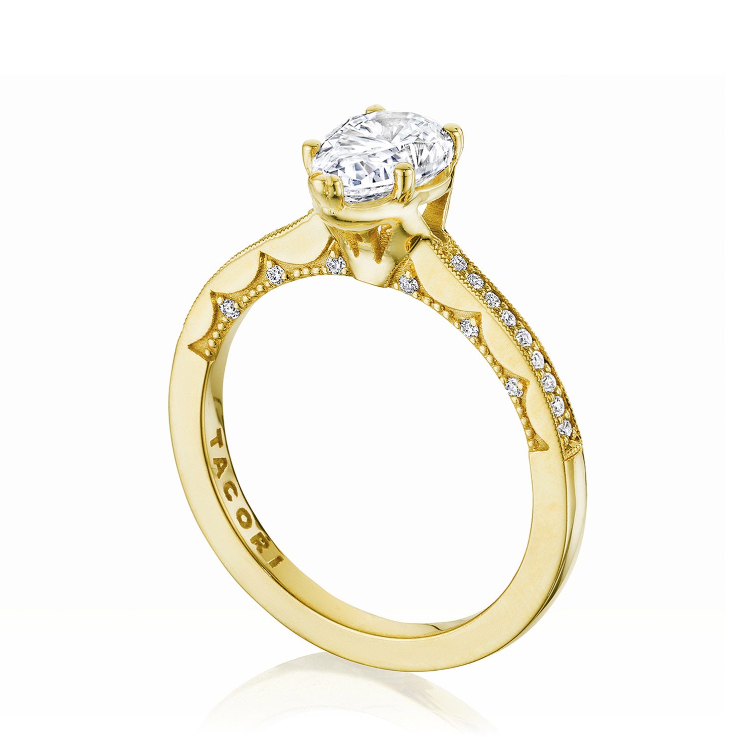 Graduating French pavé-set diamonds form marquise shapes on the ring ceiling, while diamond-studded Petite Crescent fabric decorates the innerface. The solitaire is set on an intricate Cathedral foundation, embellished with milgrain detailing.