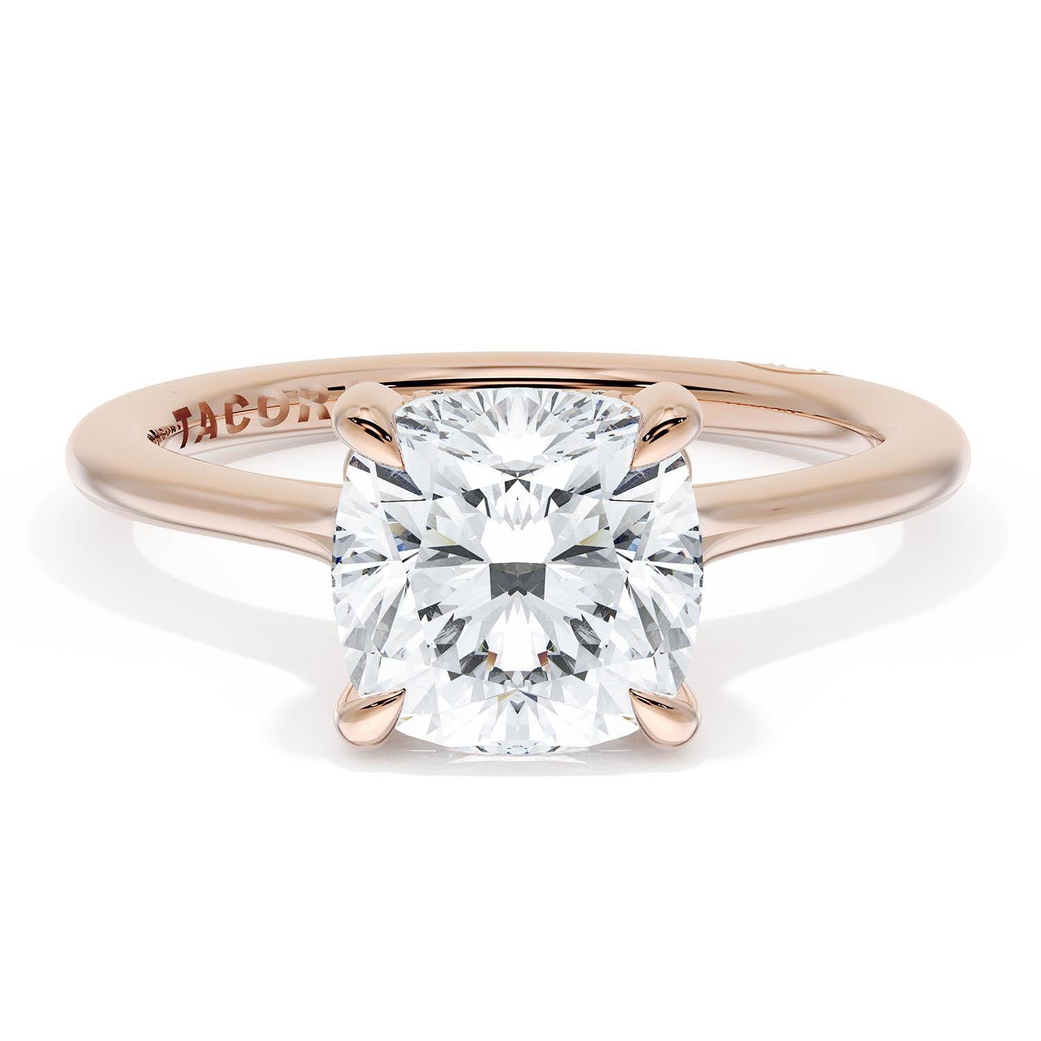 A Cushion Solitaire is set into a unique corset-inspired crown on a high-polish 18kt Rose Gold foundation. A diamond-studded Founder's Crescent marks the resting point.
