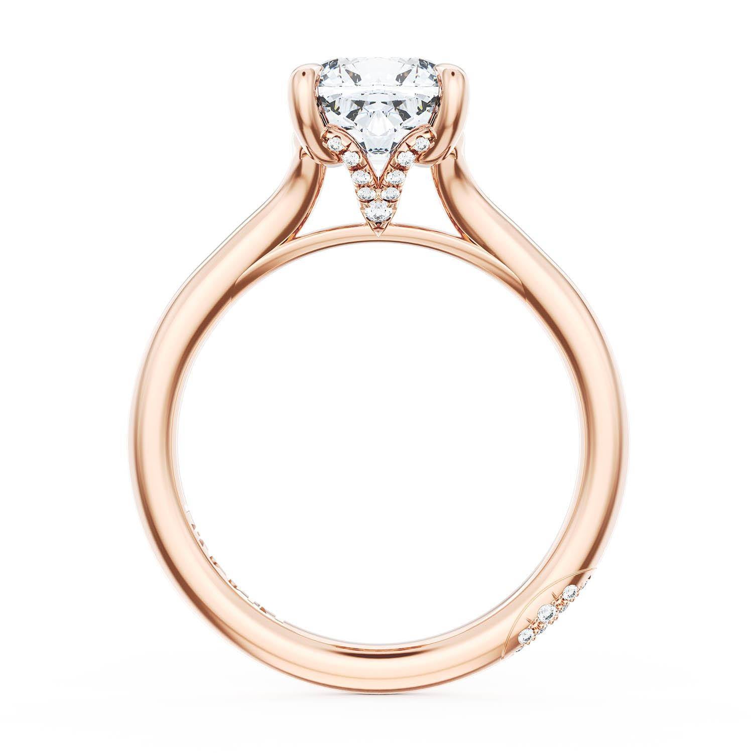 A Round solitaire is elevated by a modern bloom of round brilliant diamonds, and set into a high-polish 18kt Rose Gold foundation. TACORI Crescents add hidden detail to the underside of the crown.