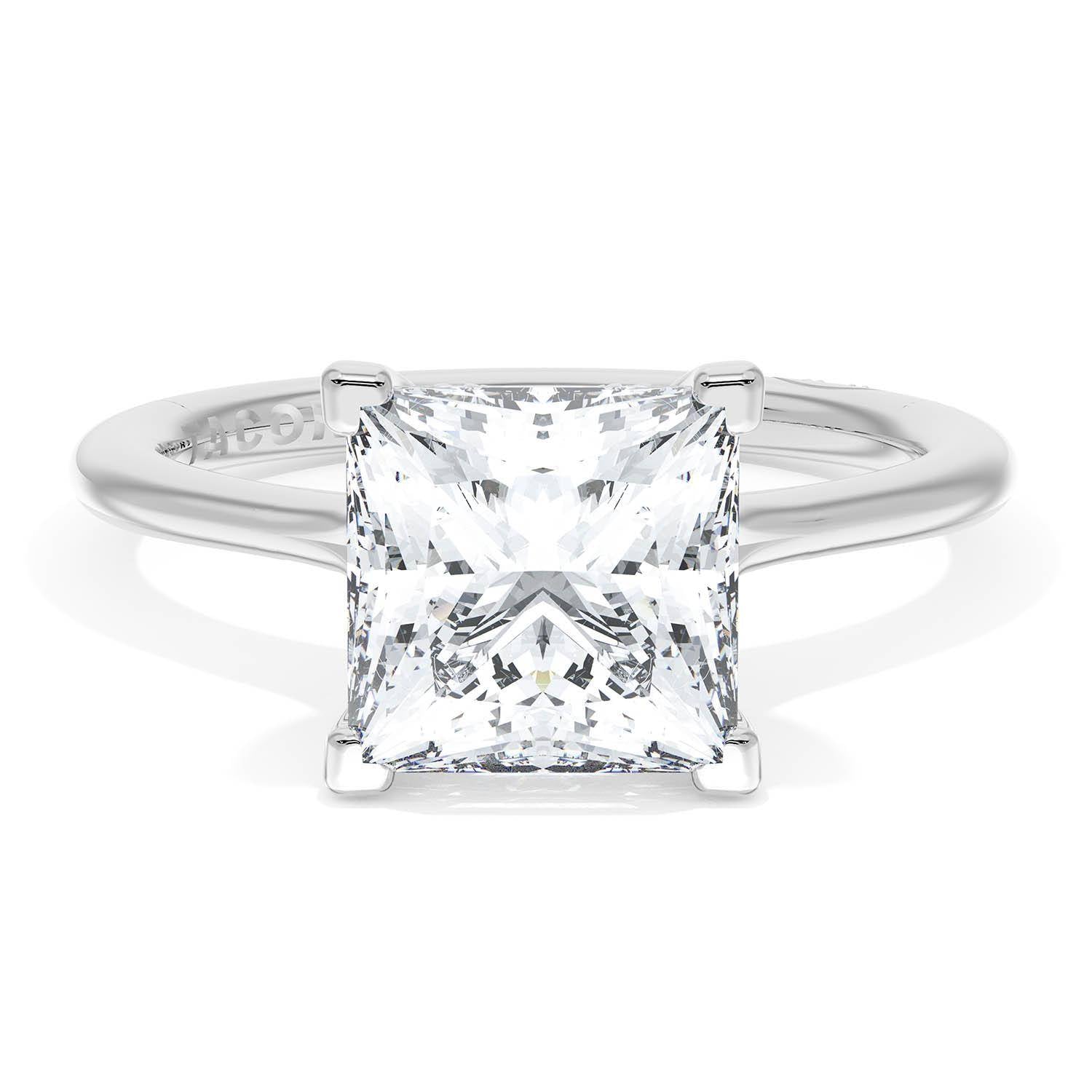 A Princess Solitaire is set into a unique diamond-studded, corset-inspired crown on a high-polish 18kt White Gold foundation. A diamond-studded Founder's Crescent marks the resting point.