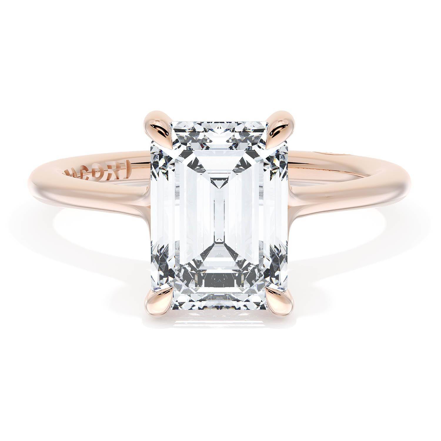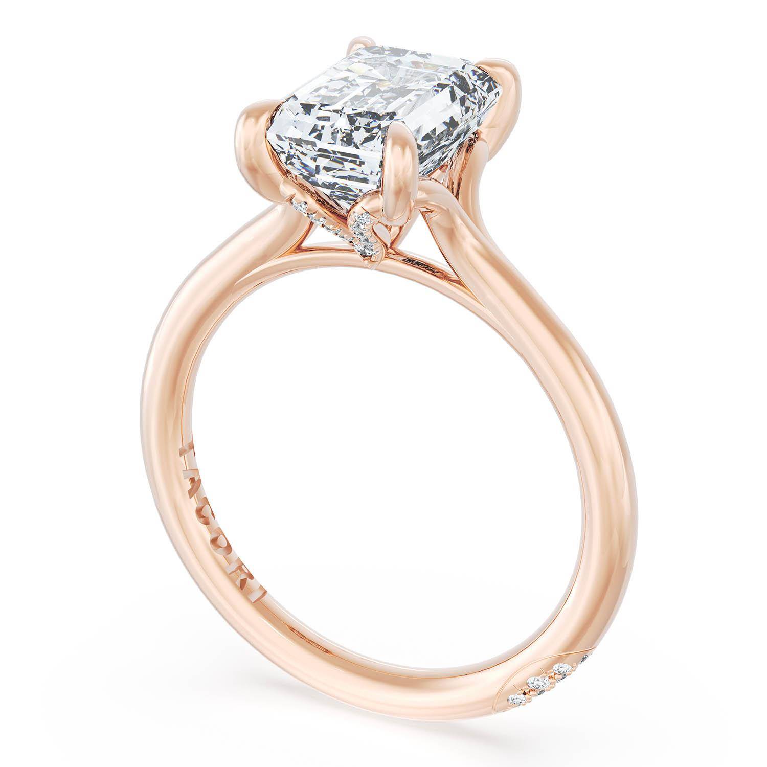 An Emerald Solitaire is set into a unique diamond-studded, corset-inspired crown on a high-polish 18kt Rose Gold foundation. A diamond-studded Founder's Crescent marks the resting point.